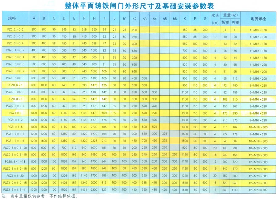 整體平面鑄鐵閘門(mén)外形尺寸及基礎(chǔ)參數(shù)表